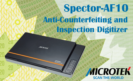 The Spector-AF10 from Microtek is a professional anti-counterfeiting and inspection digitizer. It features a color linear CCD image sensor, 4800 x 9600 dpi resolution, and a scan area of 8.5 x 11.7 inches.